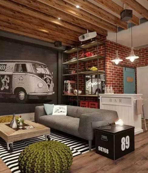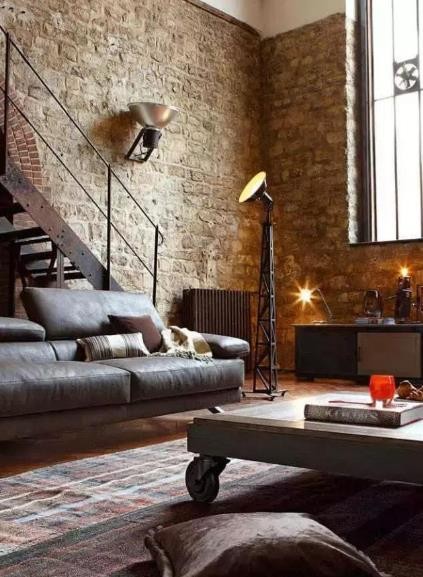 深色呢绒沙发、原木质的茶几,仿古的砖头,质朴的落地灯,皮箱制成的茶几,再配合裸露的横梁,既留下了原有的自然感又给空间注入复古的质感,使整个现代空间都弥漫着复古的氛围。