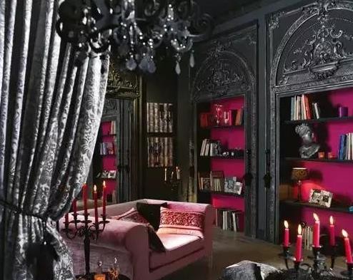 哥特式客厅喜用彩色玻璃镶嵌,色彩以蓝、深红、紫色为主,达到12色综合应用,斑斓富丽精巧迷幻,有着梦幻般的装饰意境。